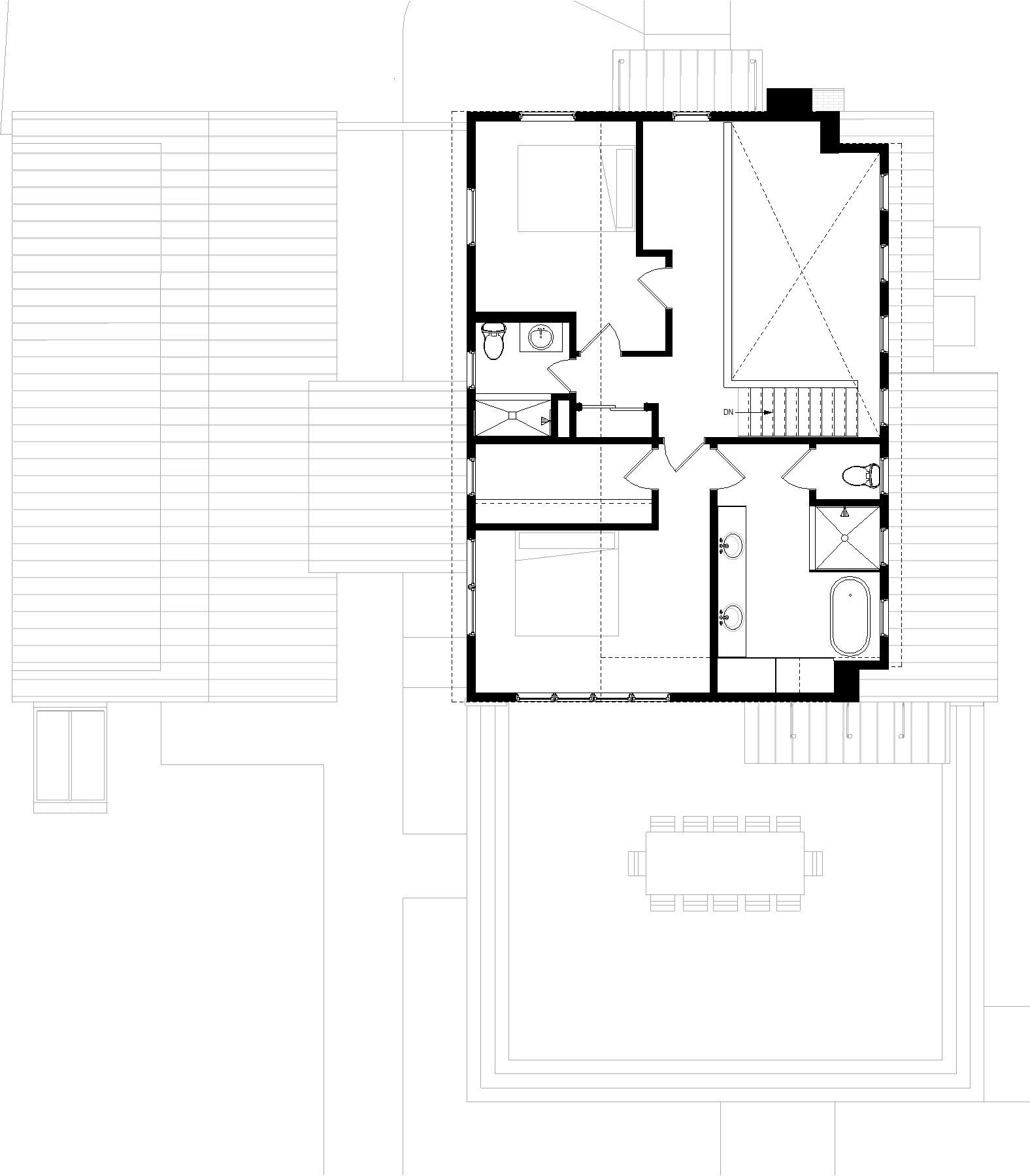 The kitchen and dining room were expanded and refocused to open onto a redesigned wrap-around deck to draw occupants outdoors. A dormer addition to the second level lifts the living room ceiling and pulls light down through the stair hall. The Garage/Art-Studio mirrors the primary residence in massing, with its own dormer flooding the studio with natural light and glass doors opening to the rear yard facing the main house. The pool house completes the rear composition: a generous open entertaining space centered on the pool, with a shed roof and modest overhang. Standing seam roofing unifies all three structures across the site.